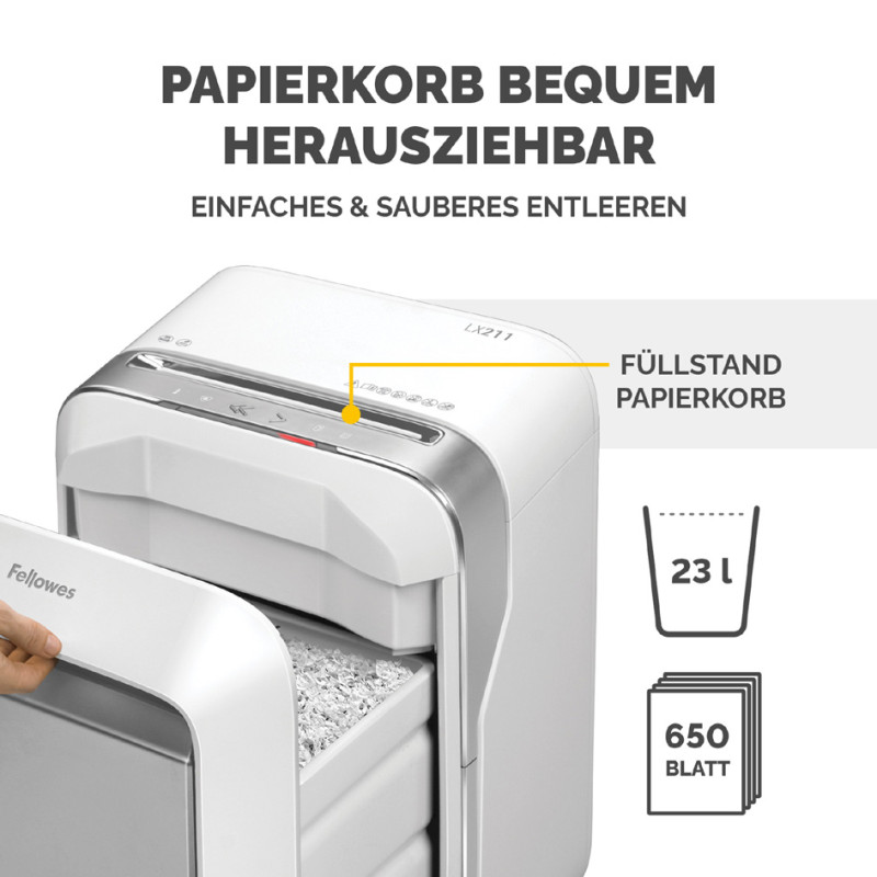 coupe croisée: 2 x 12 mm, capacité de découpe: 15 feuilles,, volume de la corbeille: 23 litres, largeur d'entrée: 230 mm,, niveau de sécurité: P-5/T-5, détruit cartes de crédit/agrafe, /trombones, affichage Intellibar, SafeSense, mode veille, (5050201)