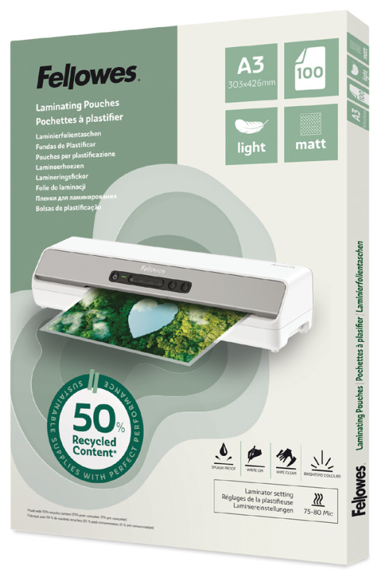 mat, fabriqué avec 50% de matériaux recyclés, version, légère à utiliser avec un réglage de plastification de 75/80, microns, 2 x 75/80 microns, dimensions: (L)303 x (H)426 mm, contenu: 100 pièces, (100143436)