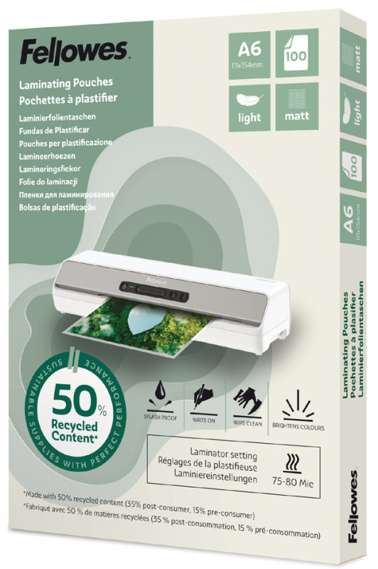 mat, fabriqué avec 50% de matériaux recyclés, version, légère à utiliser avec un réglage de plastification de 75/80, microns, 2 x 75/80 microns, dimensions: (L)216 x (H)303 mm, contenu: 100 pièces, (100143435)