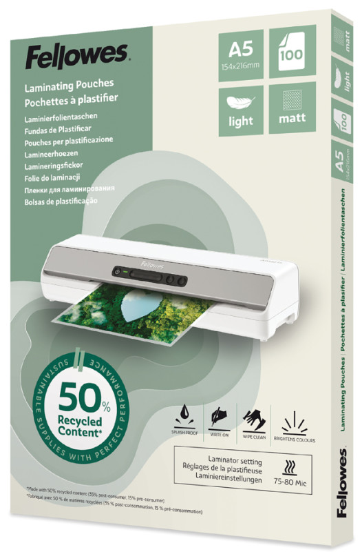 mat, fabriqué avec 50% de matériaux recyclés, version, légère à utiliser avec un réglage de plastification de 75/80, microns, 2 x 75/80 microns, dimensions: (L)111 x (H)154 mm, contenu: 100 pièces, (100143438)