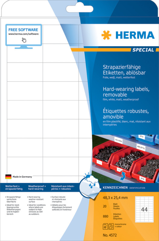 mat, durable, résistant aux intempéries, amovible, résistant, adhérent, résistant à des températures de -30 à +80 degrés, pour imprimantes laser / laser et copieurs, contenu: 480 20 étiquettes sur feuilles A4, (4573)