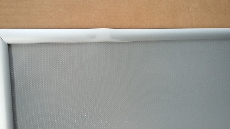 *** Beidseitig (längsseitig) leicht verbogen ***, *** Weiße Druckstelle auf der Vorderseite des Rahmens ***, silber eloxiert (355020), aus eloxiertem Aluminium, abgerundetes Rahmenprofil 25 mm,, mit Gehrungswinkeln und transparenter Antireflexfolie,