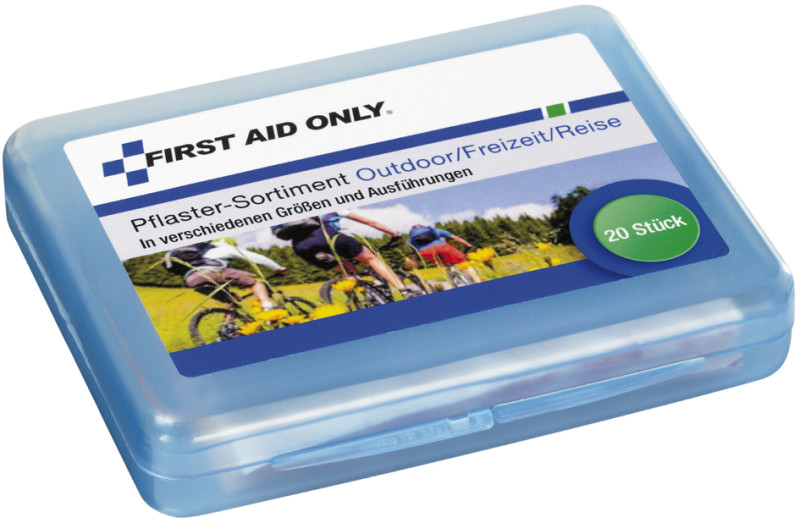 wiederverschließbare Kunststoffbox, Inhalt: 20 Pflaster, (8 Kinderpflaster, 4 Pflaster, 2 Quadratpflaster, 2 Finger-, gelenkverbände, 2 Fingerverbände, 2 Fingerkuppenverbände,, 2 Hautreinigungstücher), (P-10024)