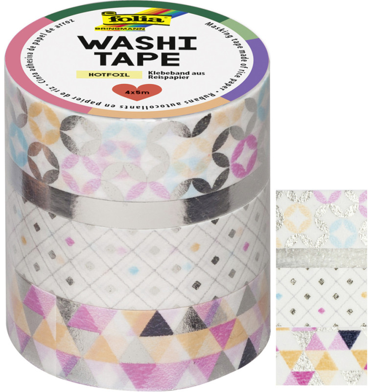 une bande de papier Washi Tape, 3 rouleaux de 15 mm x 10 m et 1 x 5 mm x 10 m, des dessins de couleur assortis, main déchirable, avec finition à chaud, sans acide, contenu: 4 roues, (26431)