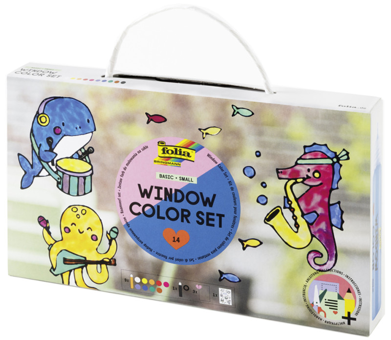 contenu: 9 peintures (blanc, jaune, pêche, rouge, lilas,, éosine, bleu, vert, marron), 1 peinture contours gris-noir,, 3 films prédécoupés Window Color, 1 feuille de motifs pour, modèles de contours, 1 manuel d'utilisation, (41019)