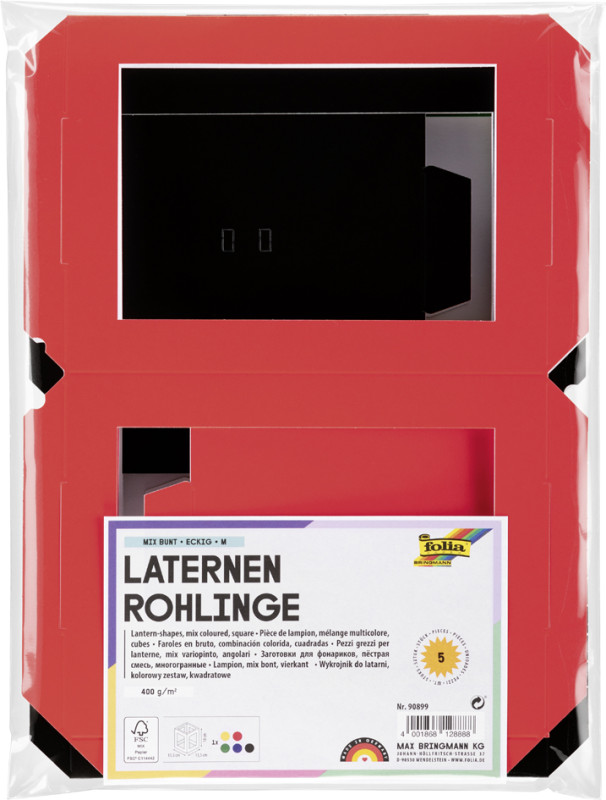 Rohling aus starkem Karton, 400 g/qm, zum Zusammenstecken,, Maße: (B)135 x (T)135 x (H)180 mm, sortiert in den Farben:, gelb, rot, grün, dunkelblau und schwarz, beinhaltet: 5 Stück, (90899)