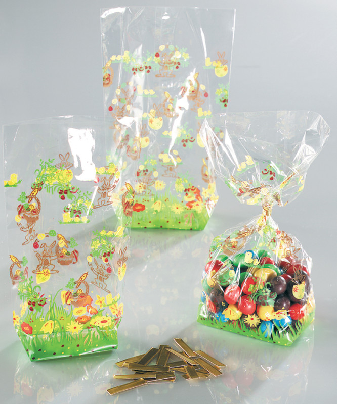 (L)145 x (H)235 mm, sachet transparent, sachet à fond,, transparent, en cellophane, avec impression de Pâques, contient: 10 sachets, (252),