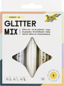 en PET, assorti dans les couleurs: or, argent et blanc,, irisé, poudre en forme de hexagone 0,3 mm, avec couvercle, diffuseur, Contenu: 5 tubes de 14 g, (57801)