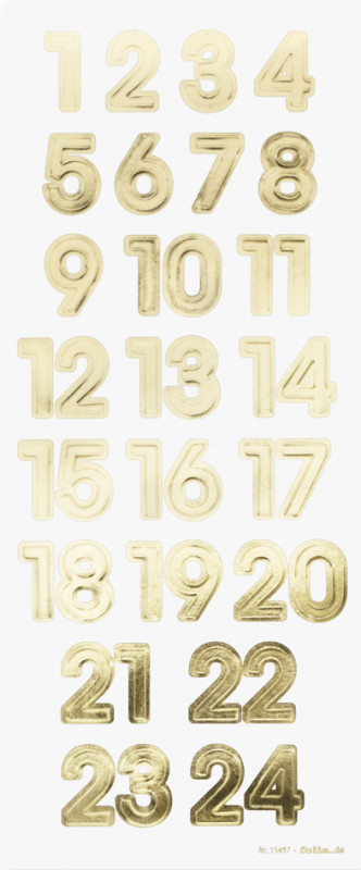 stickers de Noël à coller sur le calendrier de l'Avent,, chiffres autocollants de 1 à 24, or,, format de la planche: 100 x 240 mm, contenu: 1 planche de 24 stickers, (15497)