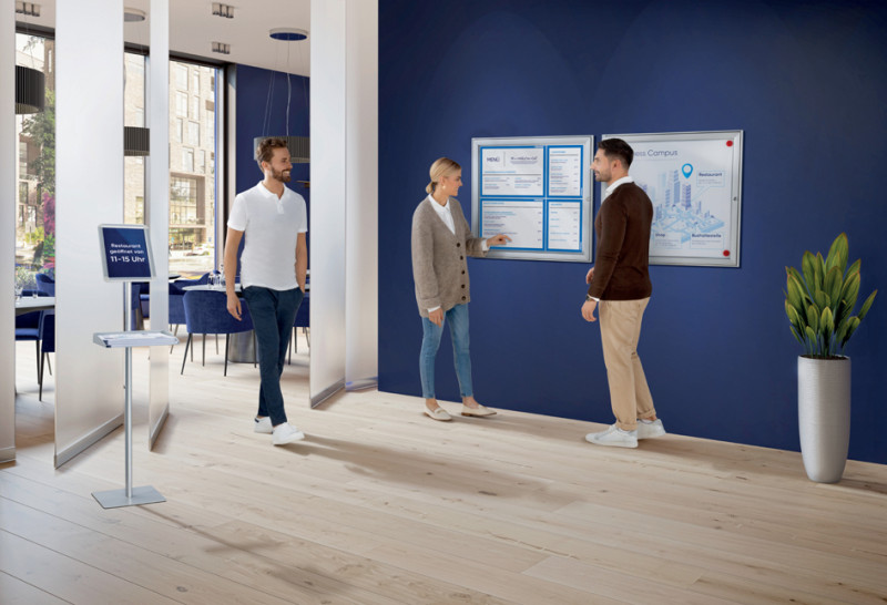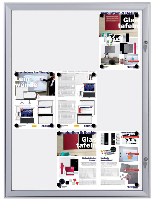 Dimensions: (B) 741 x (T) 23 x (H) 1,004 mm, cadre en aluminium, anodisé argent, portes pliantes avec serrure, résistant aux UV 3 mm, pare-brise SAN testé pour la classe de matériau de feu B1 selon DIN 4102, laqué Schreibtafel- la paroi arrière, pour un usage intérieur, (SKB9S)