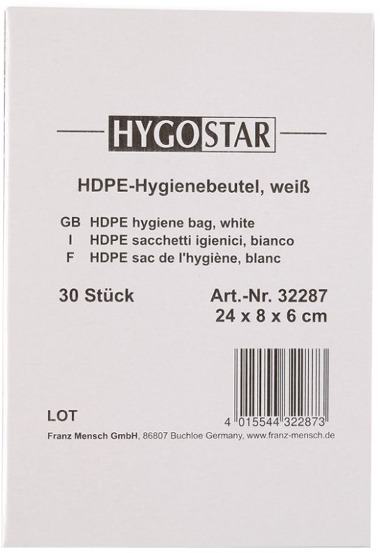 HYGOSTAR, dimensions: 240 x 80 mm, épaisseur: 9 microns,, solide, résistant, résistant à l'humidité, dans un carton, distributeur, pour jeter les protections hygiéniques, contient: 30 pièces, (32287)
