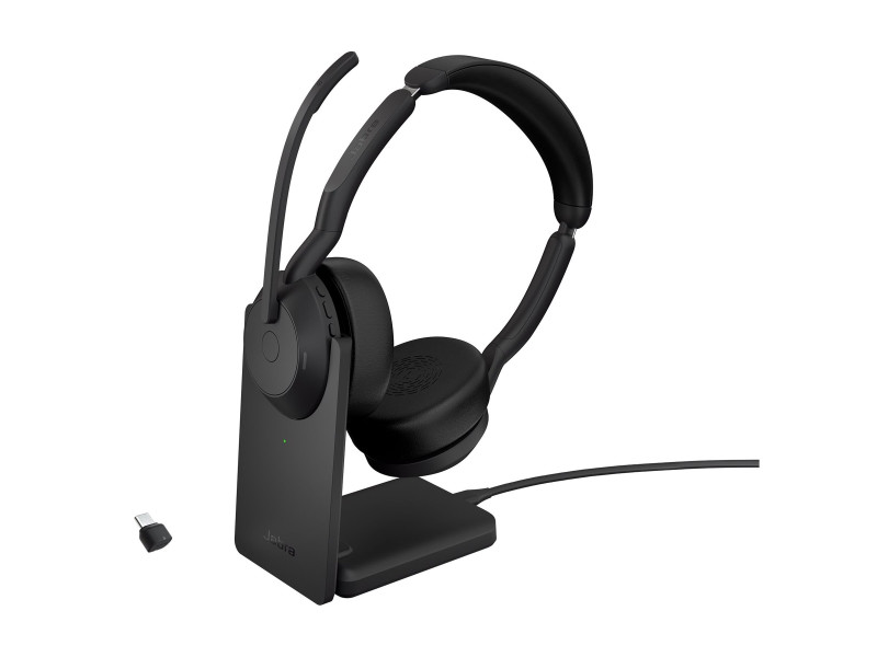 Jabra Evolve2 55 UC Stereo - Micro-casque - sur-oreille - Bluetooth - sans fil - Suppresseur de bruit actif - USB-C - noir - avec support de chargement - certifié Zoom, Cisco Webex Certified, Optimisé pour Microsoft Teams, Certifié Alcatel-Lucent, Certifié Avaya, Certifié Unify, Certifié MFi, Certifié Amazon Chime