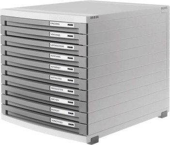 boîtier: gris sombre, tiroirs: gris sombre, en polystyrène,, pour formats A4/C4, conception stable, butée d'arrêt,, étiquettes d'indexation, à combiner individuellement, dimensions: (L)300 x (P)382 x (H)307 mm, (1510-191)