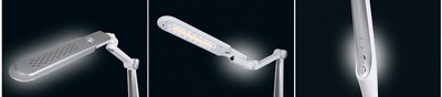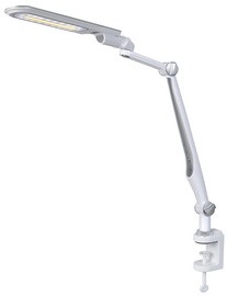 Lampe de bureau LED robuste à réglage multiple avec intensité lumineuse réglable en continu, 3 différents niveaux de couleur de lumière au choix: de blanc chaud à blanc lumière du jour. Tête de lampe orientable horizontalement et verticalement ainsi que sur l'axe longitudinale. Livré avec socle et pince.