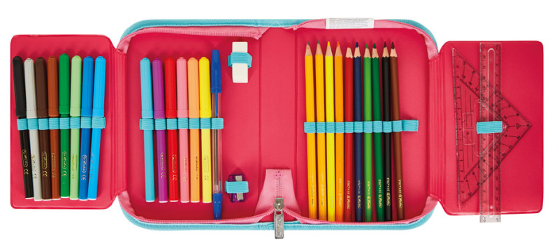 en polyester, dimensions: (L)205 x (P)140 x (H)38 mm, 2, rabats, doublure de couleur assortie, garni de feutres,, crayons de couleur, crayons à papier, règle, équerre,, stylo à bille, gomme, taille-crayon, emploi du temps, (50043279)