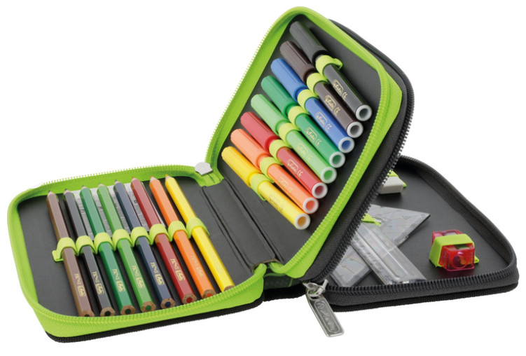 2 Fächer, Reißverschlüsse, farbiges Innenmaterial,, befüllt mit Fasermalern, Buntstiften, Bleistifte,, Anspitzer, Radiergummi, Lineal 160 mm, Geometrie-, dreieck und Kugelschreiber, (50046324)