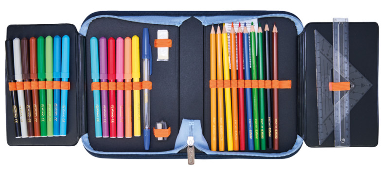 aus Polyester, Maße: (B)205 x (T)140 x (H)38 mm, 2 Klappen,, passend farbiges Innenfutter, befüllt mit Fasermalern,, Bunt- und Bleistiften, Lineal, Dreieck, Kugelschreiber,, Radierer, Anspitzer, Stundenplan und Namenskarte, (neu: 400197091 / alt: 50049189)