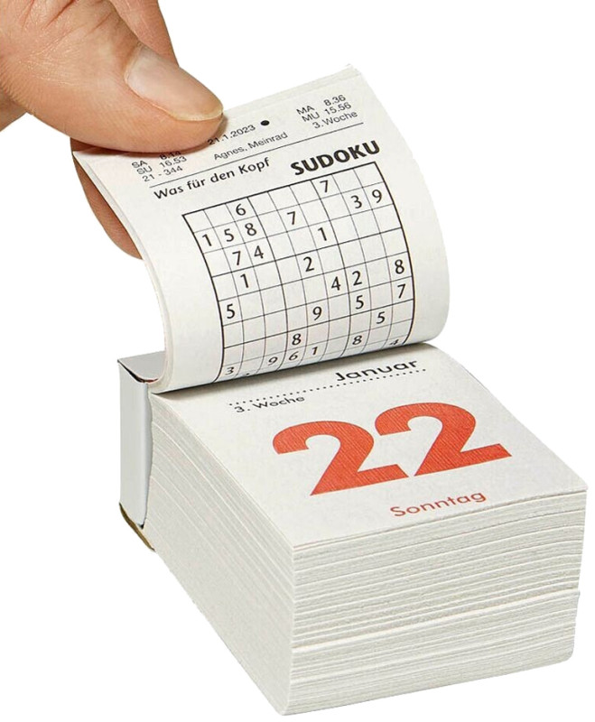 --------------------- für den Markt: D ---------------------, Blattgröße: 65 x 100 mm, Kalendarium: 1 Tag pro Seite,, Druck: 2-farbig, schwarz und rot, auf den Rückseiten Rätsel,, Witze, Tipps uvm., Metallhalterung, Papier: 48 g/qm,, (neu: 300014228 / alt: 50047840)