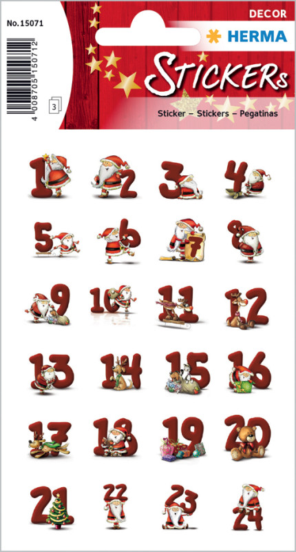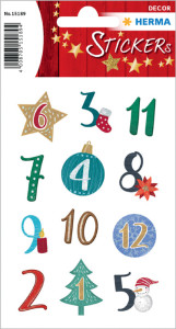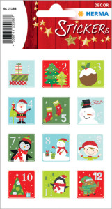 pour enfants, pailleté, autoadhésif, 24 stickers de l'Avent, carrés, numérotés de 1 à 24, motifs adaptés aux enfants,, pour embellir et décorer les calendriers de l'Avent, contenu: 2 feuilles de 12 autocollants, (15188)