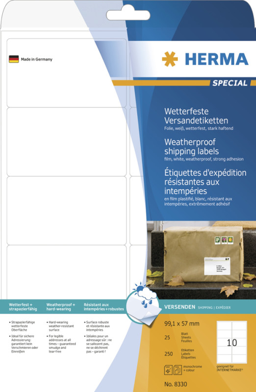 blanc, en film de polyester, résistant aux intemperies, peu, salissant, résistante au déchirure, résistance de températu-, re, avec marge, coins arrondis, pour laser + photocopieuse, contenu: 250 étiquettes sur 25 feuilles A4, (8330)