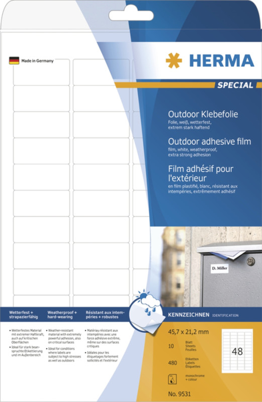 blanc, mat, avec marge, coins arrondis, film polyéthylène, adhésion très forte, oléophobe et anti-salissure,, résistant aux intempéries, pour laser + photocopieuse, contenu: 240 étiquettes sur 10 feuilles A4, (9532)
