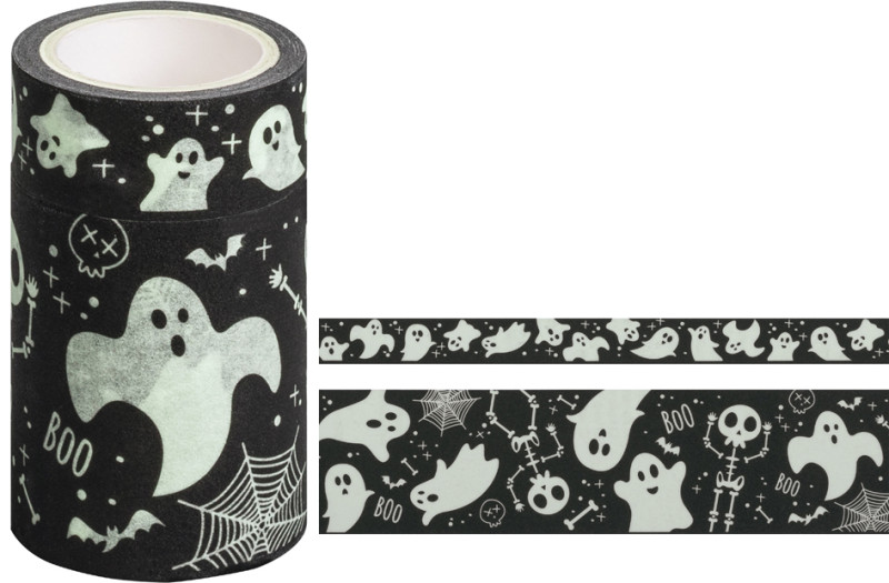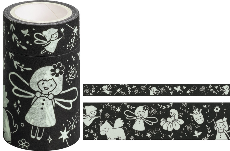 en papier, couleur: jaune phosphorescent / noir, motif avec, effet phosphorescent, dans un dévidoir avec arête de coupe,, 1 rouleau de 15 mm x 3m / 1 rouleau de 45 mm x 3 m, contenu: 2 rouleaux, (203584321)