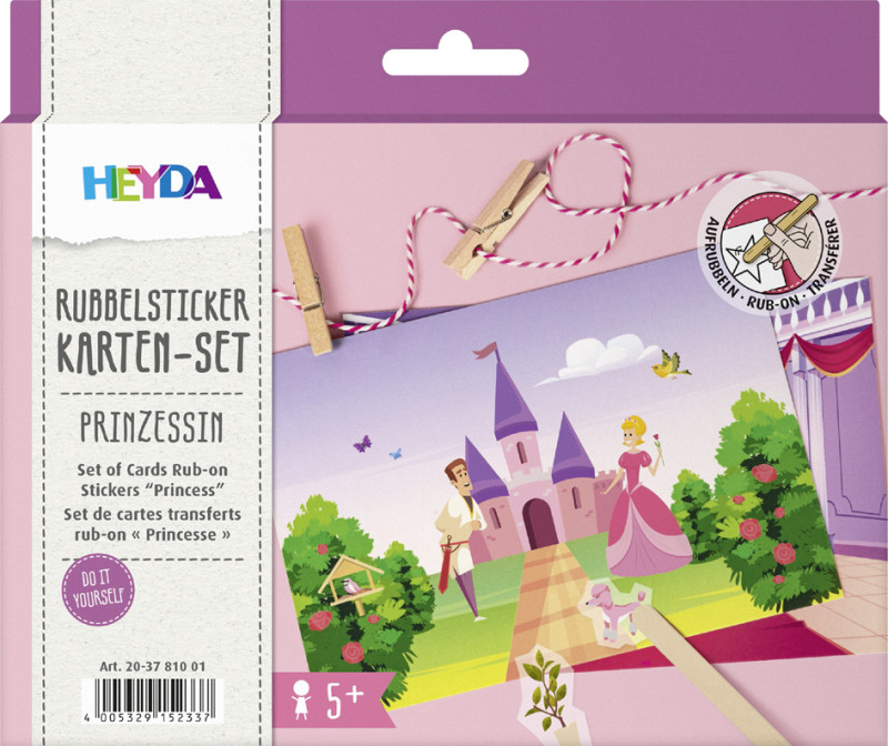 pour créer des cartes avec des transferts rub-on, 5 cartes, postales imprimées, transferts rub-on, cordelette de 2 m,, 5 pinces en bois, 1 bâtonnet en bois, avec instructions, (203781001),