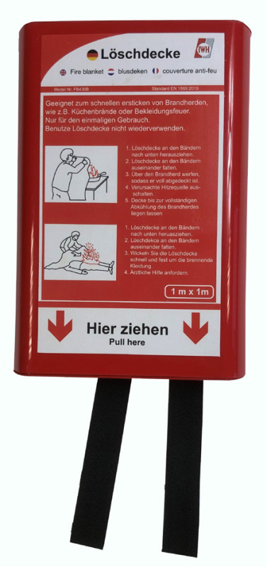 pour étouffer et éteindre rapidement les départs de feu,, par ex. voiture, cuisine, gril, etc. dim.: 1.000 x 1.000 mm,, dans une boîte rigide pratique à monter au mur, avec, languettes cousues pour un prélèvement rapide, (047044)
