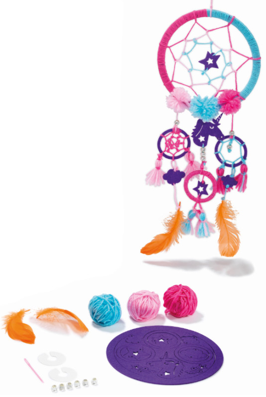 pour fabriquer un attrape-rêve, pour enfants de 6 ans et, plus, dans une mallette,, contenu: éléments en feutrine pour attrape-rêve, 3 pelotes, de laine, 1 aiguille à coudre, 6 perles, 2 plumes, 2, gabarits à pompon