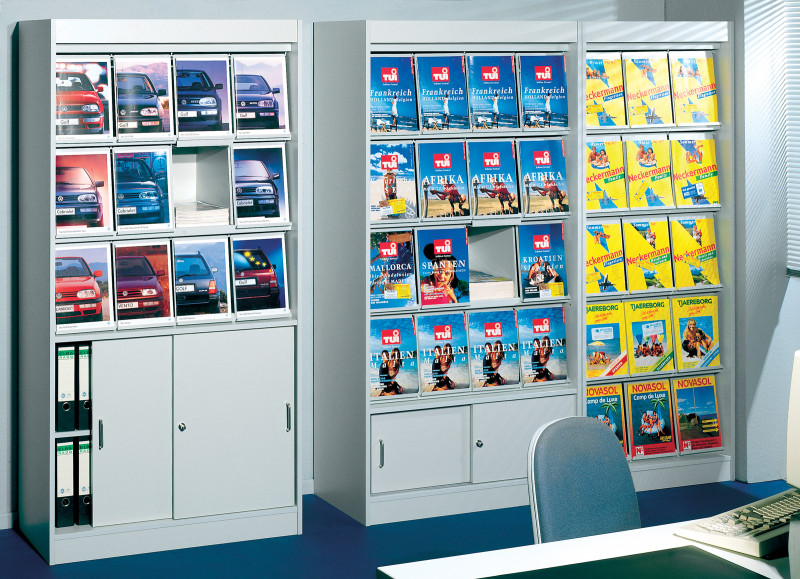 pour une présentation et un rangement des brochures, portes, rabattables inclinées avec un film de protection transparent, et un rebord d'arrêt, derrière on trouve les caisers,, livré démonté, dimensions: (L)740 x (P)420 x (H)1.910 mm, (3796)