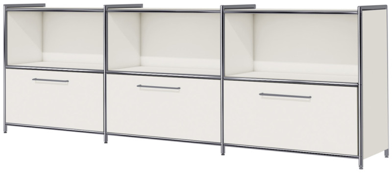 blanc, dimensions: (L)2.360 x (P)380 x (H)780 mm, 3, compartiments ouverts, panneau latéral avec tube chromé sur, 3 côtés, épaisseur du corps: 19 mm, particules de bois, qualité E1, mélaminé, poignées chromées, pieds réglables, (7998)