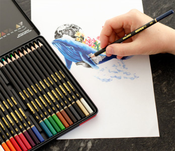 en bois de tilleul, forme triangulaire, mine résistante et, complètement collée, épaisseur de trait: 3 mm, assorti en, 24 couleurs incl. 2 métallisées, dans étui en métal, contenu: 24 crayons, (BB93325)