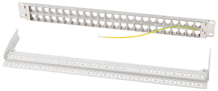 schwarz (RAL9005), 1 HE, für bis zu 48 Keystone Module,, geeignet für Netzwerk- & Multimedia Keystone Module, bis 17 mm Breite und 21 mm Höhe, Metallrahmen mit Zugent-, lastungsbügel, (NK4045)