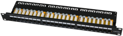 schwarz (RAL9005), 24 x RJ45 Ports, Kat. entspricht ISO/IEC, 11801 und EIA/TIA 568-C.2, für 22 - 26 AWG starre oder, flexible Adern, 90 Grad LSA Anslchluss, EIA/TIA 568 A&B,, mit Vorrichtung für Kabelmanagement, inkl. M6-Schrauben, (NP0133)