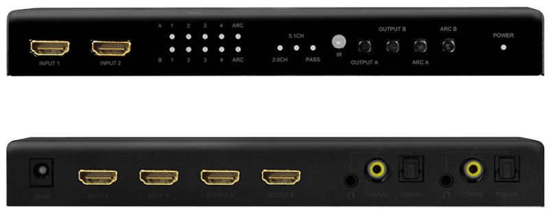 avec extracteur audio, entrée: 4x HDMI-A, 1x connecteur d', alimentation DC, sortie: 2x HDMI-A, 2x coaxial, 2x Toslink,, 2x fiche jack femelle 3,5 mm, boîtier métallique, noir, dimensions: (L)210 x (P)66 x (H)26 mm, (HD0049)
