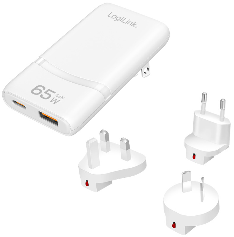 Anschlüsse: 1x USB-C Kupplung (PD), 1x USB-A Kupplung (QC),, mit fest verbautem US-Stecker sowie 3 Adaoter für EU, UK &, AU (deckt über 200 Länder & Regionen ab, Eingang: 100-240V, AC 50/60 Hz, Farbe: weiß, (PA0376)