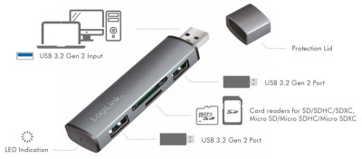 corps aluminium, entrée: USB-A mâle, sortie: 2x USB-A femel-, le, 1x micro SD & 1x SD, avec capuchon de protection, lumiè-, re LED bleue, protecion contre la surintensité & la surten-, sion, dimensions: (L)91 x (P)20 x (H)12 mm, (UA0394)