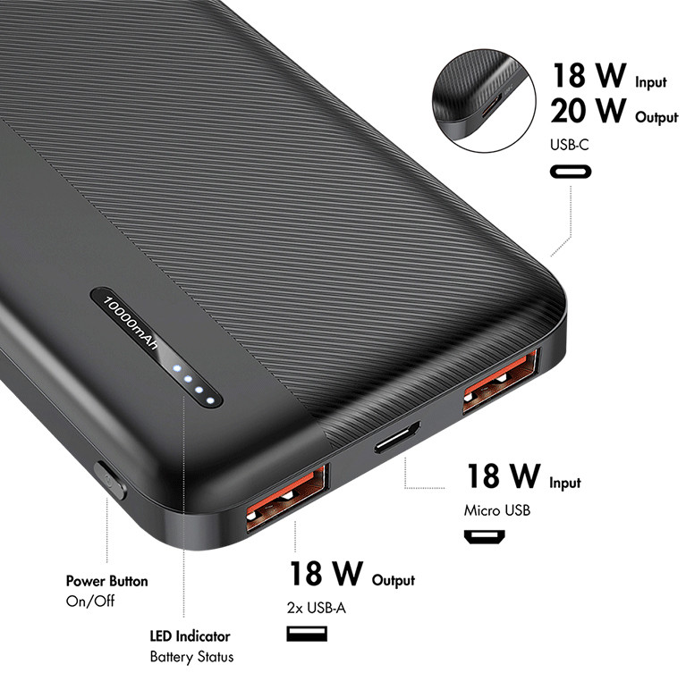 batterie supplémentaire portative pour smartphones et, tablettes, entrée: USB micro B femelle ou USB-C femelle,, sortie: 2x USB-A femelle & 2x USB-C femelle, boîtier ABS,, incl. câble de charge USB-A - USB-C de 300 mm, (PA0372)