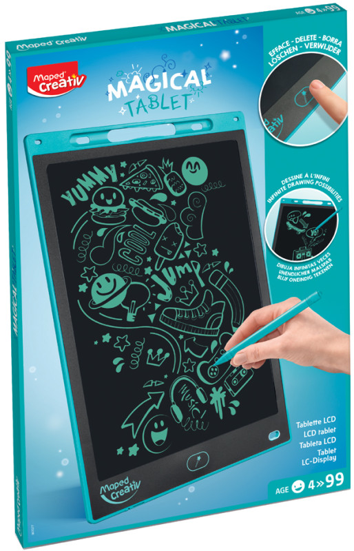 l'écran s'efface en appuyant sur le bouton comme par magie,, possibilité de verrouiller l'écran grâce au bouton au dos,, avec oeillet de suspension, stylet & pile CR2016 incl., dimension : (L)330 x (P)5 x (H)250 mm (13"), (906908)