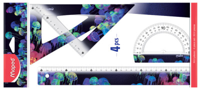 en plastique, avec motif méduses,, contenu: règle 300 mm, équerre 60 degrés 210 mm,, équerre 45 degrés 210 mm, rapporteur 180 degrés 120 mm, (981833),