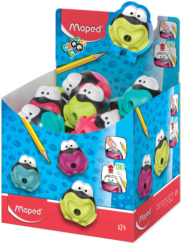 Spitzdose in Froschform, aus Kunststoff, Augen springen, heraus wenn fertig angespitzt ist, transparenter Auffangbe-, hälter, farbig sortiert in grün, blau & pink, gepackt zu 24 Stück im Display, (017711)
