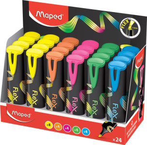 pointe ultra souple et flexible, largeur de tracé: 1,0 - 5,0, mm, avec clip, inaltérable, pour papier, fax & liasses, manifold, assorti en jaune, orange, rose, vert, bleu, dans un présentoir de 24 surligneurs, (740302)