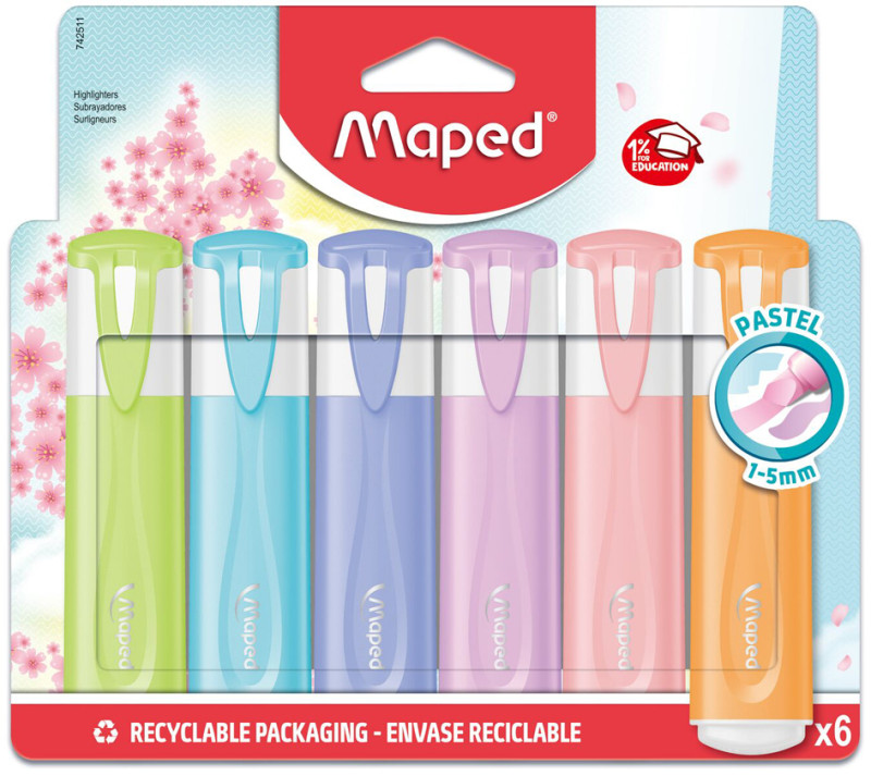 pointe biseautée, épaisseur du trait: 1 - 5 mm, avec clip,, pour papier, fax et papier pelure, assorti dans les tons, pastel rose violet, orange, myrtille, bleu, vert, contenu: 6 surligneurs, (742511)