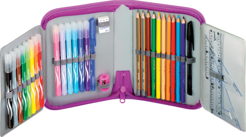 contenu: 14 feutres, 2 crayons HB, 8 crayons de couleur, triangulaire, 1 gomme Domino, 1 taille-crayon Boogy, 2, stylos bille ICE, 1 règle plastique 150 mm, 1 équerre 45, degrés, 1 équerre 60 degrés, sur carte blister, (967812)