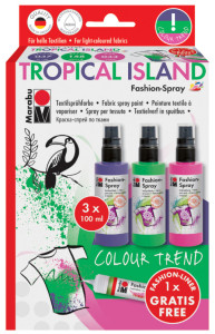 Kit TROPICAL ISLAND ,spray à base d'eau, inodore, resistant, à la lumière, couleurs brillantes, doux au toucher, chaque, 1 x 100 ml rose, prune, pomme, 1 x Fashion-Liner 25 ml, schimmer-réséda, pour textiles claires qui contiennent, (171900085)