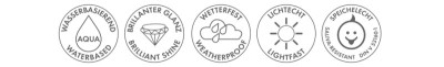 dans un flacon en verre, à base d'eau, très opaque, résiste, aux intempéries, à la salive et à la lumière, miscible,, très brillant, adaptée pour le papier, carton,, (113039021),