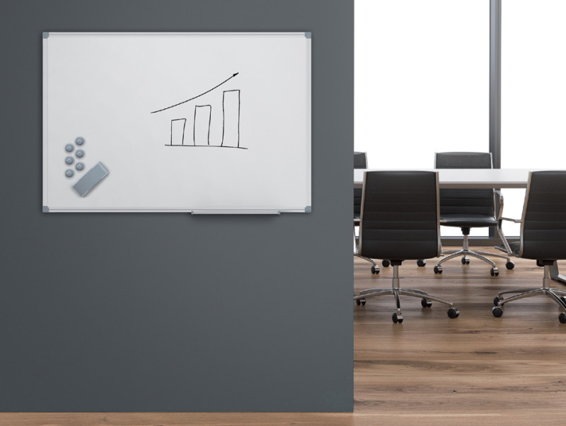 surface en tôle d'acier avec revêtement en plastique, cadre, en aluminium avec coins de jonction en gris,auget coulissant, magnétique, montage au format portrait ou paysage, avec, matériel de montage (64514-84),