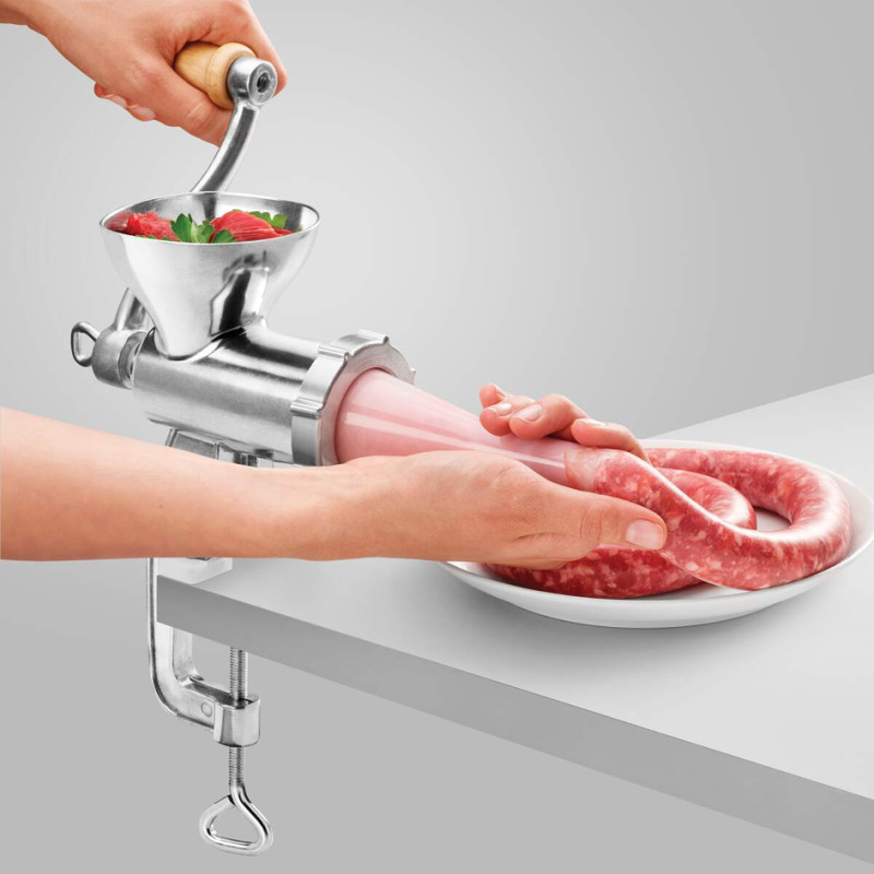 matériau: aluminium / plastique ABS et PP / bois, avec, insert pour sablés, entonnoir à saucisses et poussoir,, poignée en bois et étau de fixation, pour plan de travail de, 55 mm max., dimensions: (L)250 x (P)100 x (H)260 mm, (251724000)