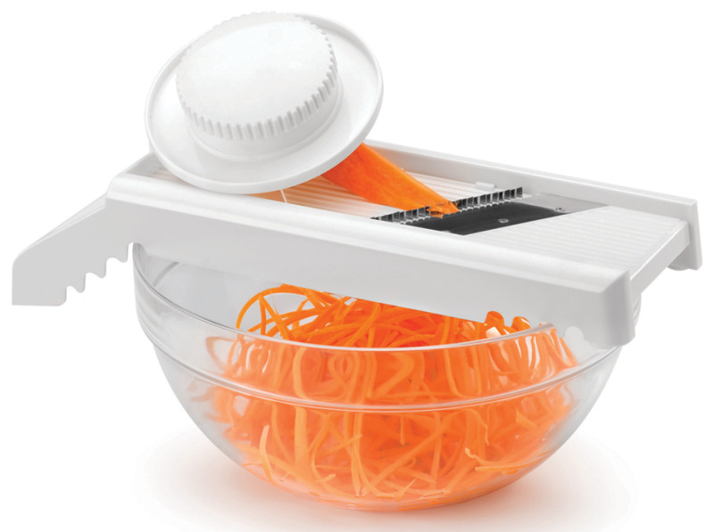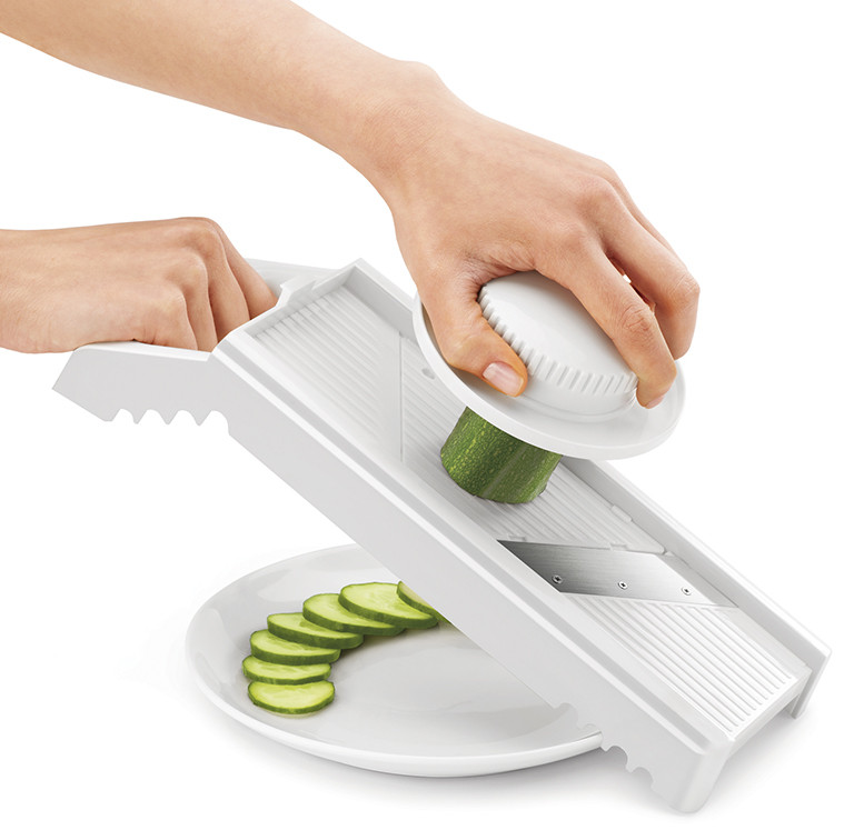 couleur: argent/blanc, matériau: acier inoxydable, plastique, ABS, lames extra tranchantes, incl. encoches et protection, pour les doigts, pour râper et couper en toute simplicité,, dimensions: (L)116 x (P)328 x (H)72 mm, (194575080)