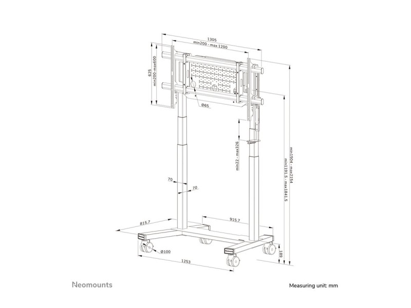 Le chariot Neomounts est conçu pour accueillir des écrans plats de 75 à 115 pouces, ce qui le rend adapté aux environnements commerciaux et éducatifs. Sa conception motorisée permet de régler facilement la hauteur et la largeur, garantissant ainsi une expérience visuelle optimale pour le public. Fabriqué en acier robuste, ce chariot offre durabilité et stabilité, supportant une charge maximale de 160 kg, ce qui le rend fiable pour les grands écrans.